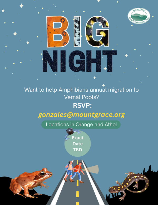 Each spring, on the warm, rainy nights when temperatures rise above 40*F and the ground has thawed, amphibians begin their annual migration to Vernal Pools for breeding; this is known as Big Night. Species such as Wood frogs, Spotted salamanders, and Spring peepers may travel hundreds of feet across roads and forests to reach their breeding site.